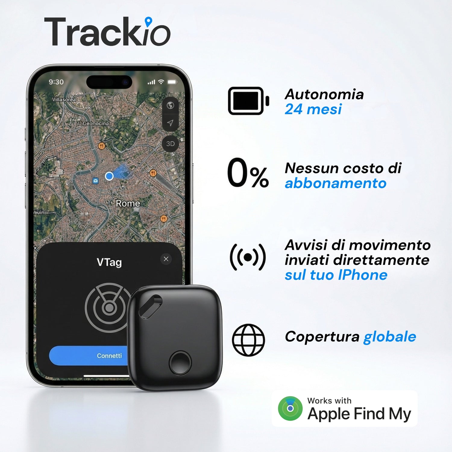 Trackio VTAG™ funziona esclusivamente con l’app ufficiale Apple “Dov’è”, senza bisogno di installare app di terze parti.